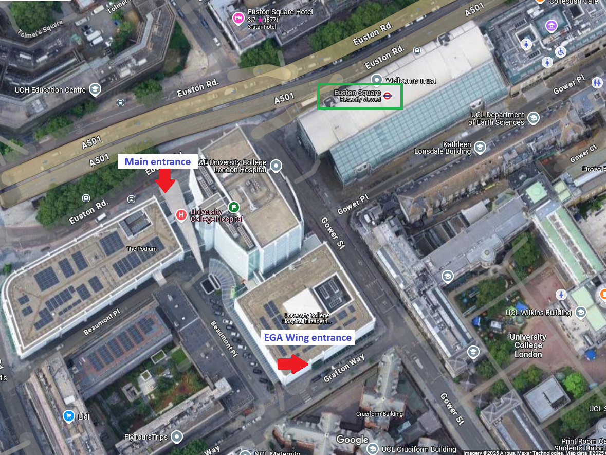 In London, you can use your bank card to tap on to the tube and local rail, so no need to worry about ticket machines. UCLH has multiple buildings. Foetal Medicine is in the Elizabeth Garret Anderson wing. The entrance to the EGA wing is on Grafton Way, or you can use the main entrance on Euston Road.